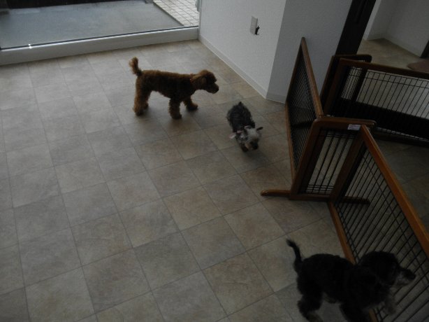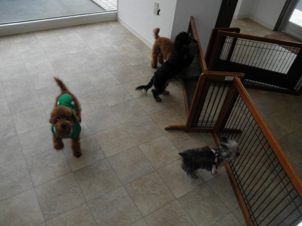 女の子3頭に男の子1頭でした。軽く追いかけたりしている様子が見られましたが、みんな一緒に遊ぶ様子もなく、バラバラに行動していました。まだまだ犬より人が好きなようです。