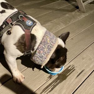 最近は朝夕の涼しい時間帯にお散歩したり、保冷剤入りのクールネックを使ったりと