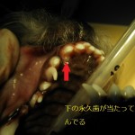 写真のように咬み合う際に下の永久歯の犬歯が上顎に当たってしまいます。