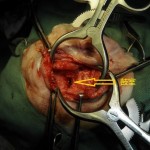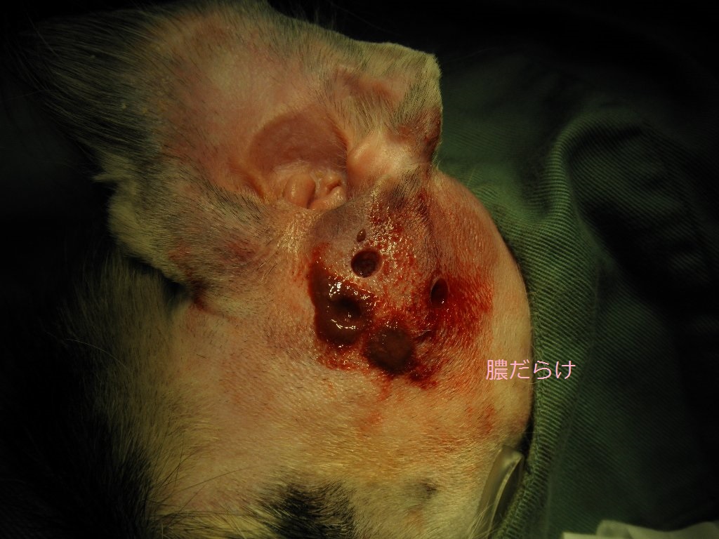 まず、穴を開けて(ドレナージ)見たところ、中から大量の膿が出てきました。