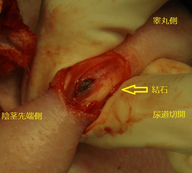 外科的に尿道切開を実施し、結石除去、同時に膀胱内にある結石も除去し、尿道、膀胱縫合を行い手術を終了しました。