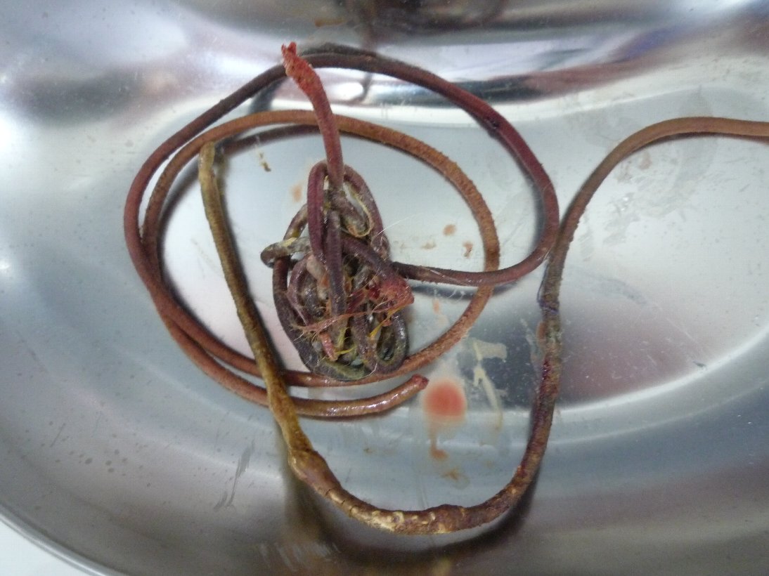 ゴムが腸(回腸付近~盲腸にかけて)に絡まっていました。