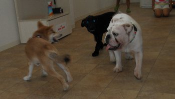 …柴犬、ブルドック、ラブラドールレトリバーの3頭に集まってもらいました。